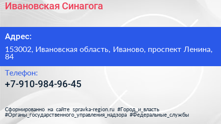Ивановская Синагога по адресу 153002, Ивановская область, Иваново, проспект Ленина, 84 в дальнейшем Организация, размещена в следующих категориях: