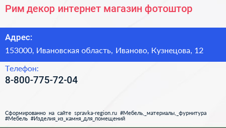 Рим декор, интернет-магазин фотоштор по адресу 153000, Ивановская область, Иваново, Кузнецова, 12 в дальнейшем Организация, размещена в следующих категориях: