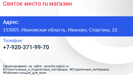 Святое место.ru, магазин по адресу 153005, Ивановская область, Иваново, Спартака, 22 в дальнейшем Организация, размещена в следующих категориях: