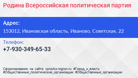 Родина, Всероссийская политическая партия по адресу 153012, Ивановская область, Иваново, Советская, 22 в дальнейшем Организация, размещена в следующих категориях: