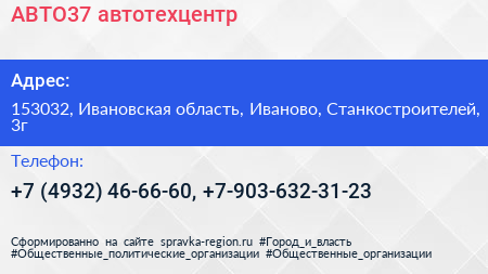 АВТО37, автотехцентр по адресу 153032, Ивановская область, Иваново, Станкостроителей, 3г в дальнейшем Организация, размещена в следующих категориях: