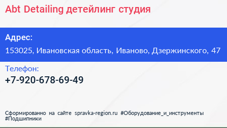Abt Detailing, детейлинг-студия по адресу 153025, Ивановская область, Иваново, Дзержинского, 47 в дальнейшем Организация, размещена в следующих категориях: