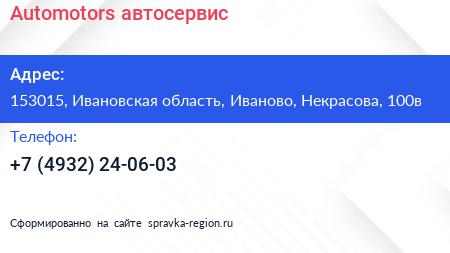 Automotors, автосервис по адресу 153015, Ивановская область, Иваново, Некрасова, 100в в дальнейшем Организация, размещена в следующих категориях: