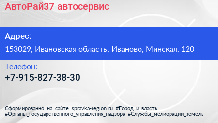 АвтоРай37, автосервис по адресу 153029, Ивановская область, Иваново, Минская, 120 в дальнейшем Организация, размещена в следующих категориях: