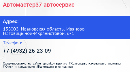 Автомастер37, автосервис по адресу 153003, Ивановская область, Иваново, Наговицыной-Икрянистовой, 6/1 в дальнейшем Организация, размещена в следующих категориях: