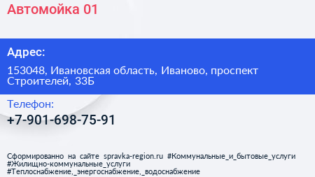Автомойка 01 по адресу 153048, Ивановская область, Иваново, проспект Строителей, 33Б в дальнейшем Организация, размещена в следующих категориях: