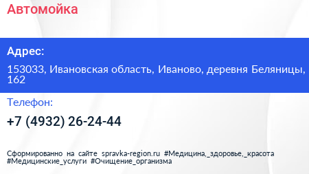 Автомойка по адресу 153033, Ивановская область, Иваново, деревня Беляницы, 162 в дальнейшем Организация, размещена в следующих категориях: