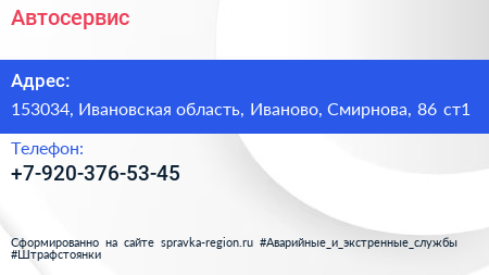 Автосервис по адресу 153034, Ивановская область, Иваново, Смирнова, 86 ст1 в дальнейшем Организация, размещена в следующих категориях: