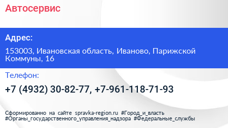 Автосервис по адресу 153003, Ивановская область, Иваново, Парижской Коммуны, 16 в дальнейшем Организация, размещена в следующих категориях: