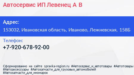 Автосервис, ИП Левенец А.В. по адресу 153032, Ивановская область, Иваново, Лежневская, 158Б в дальнейшем Организация, размещена в следующих категориях:
