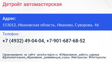 Детройт, автомастерская по адресу 153012, Ивановская область, Иваново, Суворова, 46 в дальнейшем Организация, размещена в следующих категориях:
