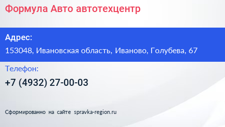 Формула Авто, автотехцентр по адресу 153048, Ивановская область, Иваново, Голубева, 67 в дальнейшем Организация, размещена в следующих категориях:
