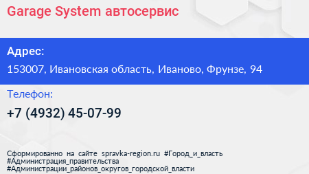 Garage System, автосервис по адресу 153007, Ивановская область, Иваново, Фрунзе, 94 в дальнейшем Организация, размещена в следующих категориях: