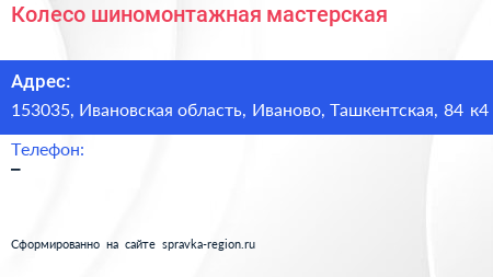 Колесо, шиномонтажная мастерская по адресу 153035, Ивановская область, Иваново, Ташкентская, 84 к4 в дальнейшем Организация, размещена в следующих категориях: