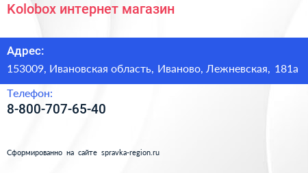 Kolobox, интернет-магазин по адресу 153009, Ивановская область, Иваново, Лежневская, 181а в дальнейшем Организация, размещена в следующих категориях:
