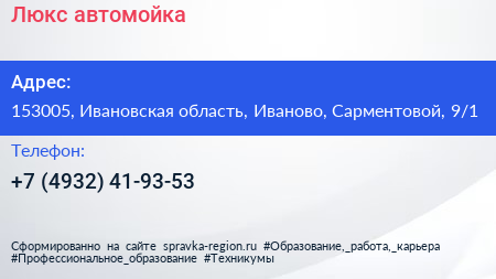 Люкс, автомойка по адресу 153005, Ивановская область, Иваново, Сарментовой, 9/1 в дальнейшем Организация, размещена в следующих категориях: