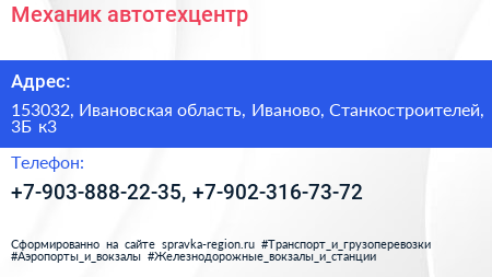 Механик, автотехцентр по адресу 153032, Ивановская область, Иваново, Станкостроителей, 3Б к3 в дальнейшем Организация, размещена в следующих категориях: