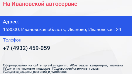 На Ивановской, автосервис по адресу 153000, Ивановская область, Иваново, Ивановская, 24 в дальнейшем Организация, размещена в следующих категориях: