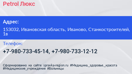 Petrol-Люкс по адресу 153032, Ивановская область, Иваново, Станкостроителей, 1в в дальнейшем Организация, размещена в следующих категориях: