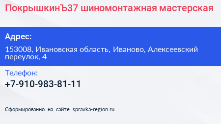 ПокрышкинЪ37, шиномонтажная мастерская по адресу 153008, Ивановская область, Иваново, Алексеевский переулок, 4 в дальнейшем Организация, размещена в следующих категориях: