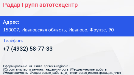 Радар Групп, автотехцентр по адресу 153007, Ивановская область, Иваново, Фрунзе, 90 в дальнейшем Организация, размещена в следующих категориях: