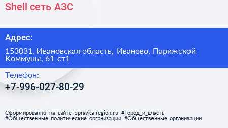 Shell, сеть АЗС по адресу 153031, Ивановская область, Иваново, Парижской Коммуны, 61 ст1 в дальнейшем Организация, размещена в следующих категориях: