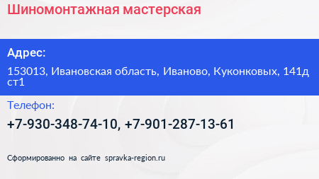 Шиномонтажная мастерская по адресу 153013, Ивановская область, Иваново, Куконковых, 141д ст1 в дальнейшем Организация, размещена в следующих категориях: