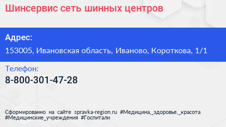 Шинсервис, сеть шинных центров по адресу 153005, Ивановская область, Иваново, Короткова, 1/1 в дальнейшем Организация, размещена в следующих категориях: