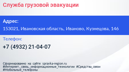Служба грузовой эвакуации по адресу 153021, Ивановская область, Иваново, Кузнецова, 146 в дальнейшем Организация, размещена в следующих категориях: