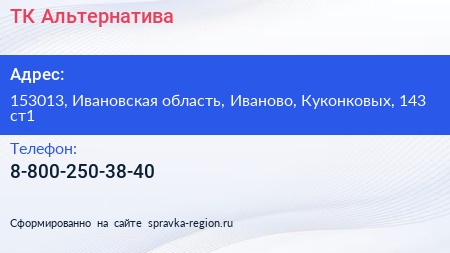 ТК Альтернатива по адресу 153013, Ивановская область, Иваново, Куконковых, 143 ст1 в дальнейшем Организация, размещена в следующих категориях: