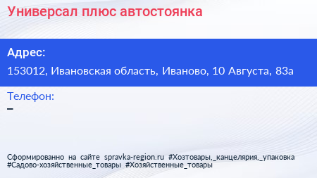 Универсал плюс, автостоянка по адресу 153012, Ивановская область, Иваново, 10 Августа, 83а в дальнейшем Организация, размещена в следующих категориях: