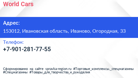 World Cars по адресу 153012, Ивановская область, Иваново, Огородная, 33 в дальнейшем Организация, размещена в следующих категориях: