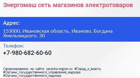 Энергомаш, сеть магазинов электротоваров по адресу 153000, Ивановская область, Иваново, Богдана Хмельницкого, 30 в дальнейшем Организация, размещена в следующих категориях: