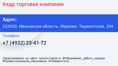 Кедр, торговая компания по адресу 153032, Ивановская область, Иваново, Ташкентская, 104 в дальнейшем Организация, размещена в следующих категориях: