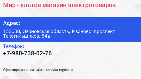 Мир пультов, магазин электротоваров по адресу 153038, Ивановская область, Иваново, проспект Текстильщиков, 54а в дальнейшем Организация, размещена в следующих категориях: