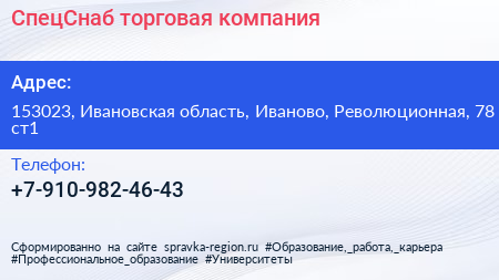 СпецСнаб, торговая компания по адресу 153023, Ивановская область, Иваново, Революционная, 78 ст1 в дальнейшем Организация, размещена в следующих категориях: