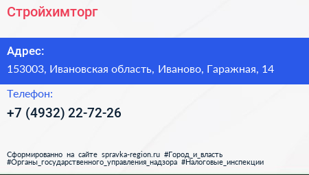 Стройхимторг по адресу 153003, Ивановская область, Иваново, Гаражная, 14 в дальнейшем Организация, размещена в следующих категориях: