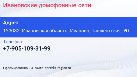 Ивановские домофонные сети по адресу 153032, Ивановская область, Иваново, Ташкентская, 90 в дальнейшем Организация, размещена в следующих категориях: