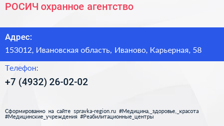 РОСИЧ, охранное агентство по адресу 153012, Ивановская область, Иваново, Карьерная, 58 в дальнейшем Организация, размещена в следующих категориях: