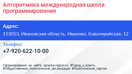 Алгоритмика, международная школа программирования по адресу 153013, Ивановская область, Иваново, Кавалерийская, 12 в дальнейшем Организация, размещена в следующих категориях: