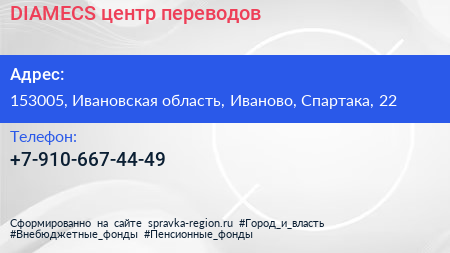 DIAMECS, центр переводов по адресу 153005, Ивановская область, Иваново, Спартака, 22 в дальнейшем Организация, размещена в следующих категориях: