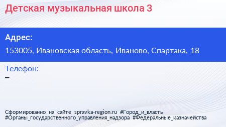 Детская музыкальная школа №3 по адресу 153005, Ивановская область, Иваново, Спартака, 18 в дальнейшем Организация, размещена в следующих категориях: