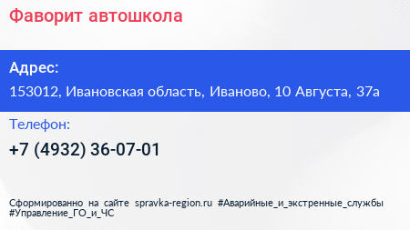 Фаворит, автошкола по адресу 153012, Ивановская область, Иваново, 10 Августа, 37а в дальнейшем Организация, размещена в следующих категориях: