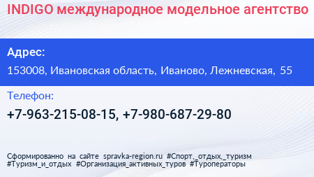 INDIGO, международное модельное агентство по адресу 153008, Ивановская область, Иваново, Лежневская, 55 в дальнейшем Организация, размещена в следующих категориях: