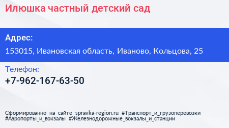 Илюшка, частный детский сад по адресу 153015, Ивановская область, Иваново, Кольцова, 25 в дальнейшем Организация, размещена в следующих категориях: