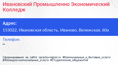 Ивановский Промышленно-Экономический Колледж по адресу 153022, Ивановская область, Иваново, Велижская, 60а в дальнейшем Организация, размещена в следующих категориях: