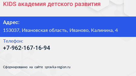 KIDS, академия детского развития по адресу 153037, Ивановская область, Иваново, Калинина, 4 в дальнейшем Организация, размещена в следующих категориях: