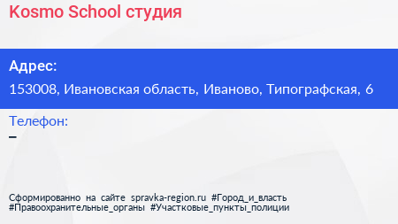 Kosmo School, студия по адресу 153008, Ивановская область, Иваново, Типографская, 6 в дальнейшем Организация, размещена в следующих категориях: