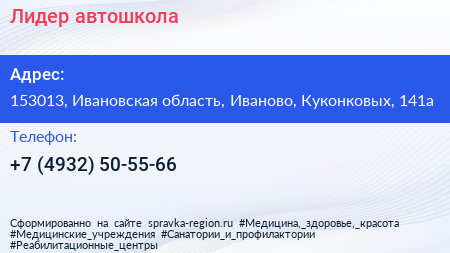 Лидер, автошкола по адресу 153013, Ивановская область, Иваново, Куконковых, 141а в дальнейшем Организация, размещена в следующих категориях: