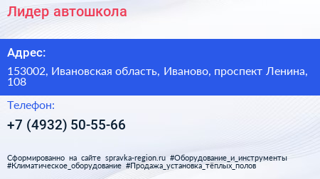 Лидер, автошкола по адресу 153002, Ивановская область, Иваново, проспект Ленина, 108 в дальнейшем Организация, размещена в следующих категориях: